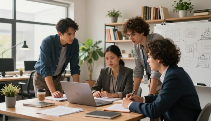 A modern workspace focused on niche validation for starting a business, featuring a diverse group of founders collaborating around a sleek table filled with laptops, notepads, and market research materials. In the foreground, show a close-up of hands pointing at graphs on a laptop screen, illustrating analytics and observations. The middle ground captures the group's engaged expressions as they discuss ideas, dressed in professional business attire. The background reveals a bright, airy room adorned with motivational wall art and a whiteboard displaying brainstorming notes. Soft natural light floods the space, creating a friendly and inspiring atmosphere that encourages creativity and collaboration. The overall mood emphasizes innovation and determination, suitable for a global startup scene.