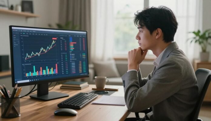 In the foreground, a sleek, modern investing dashboard displays colorful graphs and charts detailing FIRE progress milestones, with clear upward trends. A professional young adult sits at a stylish desk in modest casual clothing, intently analyzing the data on the screen. In the middle ground, a cozy home office is subtly styled with greenery and personal touches, evoking a calm lifestyle. Soft, cinematic lighting streams through a nearby window, casting gentle shadows and enhancing the atmosphere of focus and tranquility. In the background, a blurred view of a city skyline suggests a bright future, symbolizing financial independence and the fruits of disciplined investing habits. The overall mood is optimistic and reflective, ideal for discussing behavioral FIRE milestones.