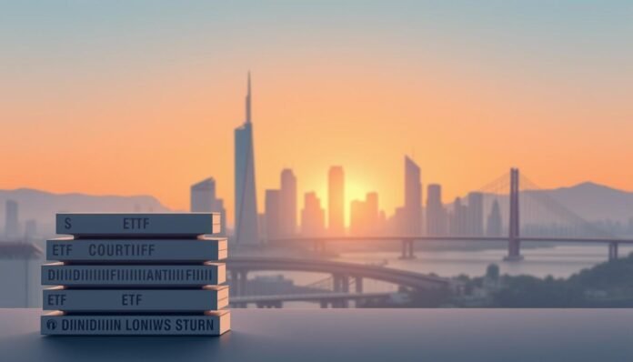 A modern and minimalist illustration of a diverse portfolio of dividend-paying exchange-traded funds (ETFs). In the foreground, a stack of stylized ETF icons in muted tones representing various sectors and asset classes. The middle ground features a clean, geometric cityscape with skyscrapers and bridges, symbolizing financial stability and growth. The background showcases a serene, twilight sky with a warm, golden glow, conveying a sense of tranquility and long-term potential. The overall composition exudes a professional, sophisticated, and aspirational vibe, befitting the "low-risk, high-reward" investment theme. Lighting is soft and diffused, with a focus on clean, modern aesthetics.