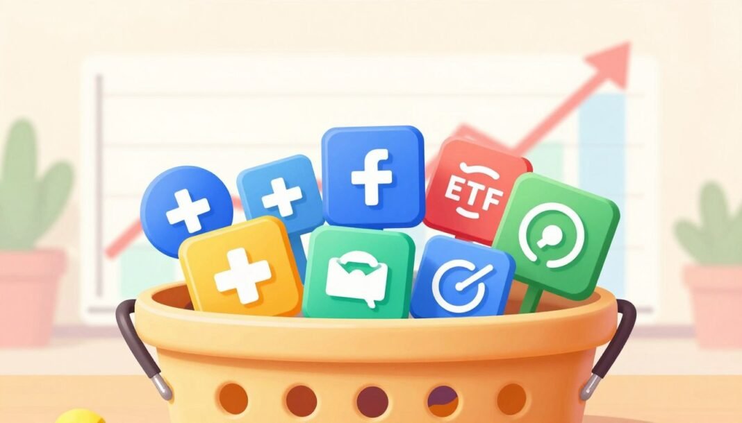 A cartoon-style illustration depicting a cheerful basket labeled "ETF" filled with simple icons representing various stocks, such as technology, healthcare, and energy sectors. In the foreground, the basket is vibrant and inviting, with a few icons spilling out to showcase the diversity of investments. In the middle ground, a clean, modern educational backdrop includes abstract representations of financial graphs and upward trends, symbolizing growth and opportunity. The background features a bright, optimistic sky, conveying a sense of hope and positive outlook on investing. The lighting is warm and inviting, with soft shadows adding depth. The overall mood is professional yet friendly, appealing to both novice and experienced investors. No text or logos included.